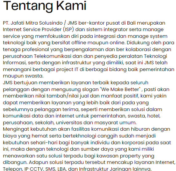 Jafati Mitra Solusindo menyediakan solusi terdepan untuk kebutuhan internet dan WiFi Anda. Kami menawarkan konektivitas handal yang memastikan Anda tetap terhubung di era digital ini. Dengan layanan yang cepat, stabil, dan didukung oleh tim teknis yang kompeten, kami menghadirkan pengalaman terbaik untuk memenuhi semua kebutuhan konektivitas Anda.